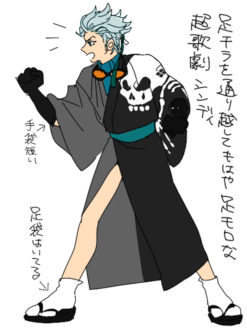 逆に龍馬は、ひっくり返ったり激しいダンスがあったりなのであらかじめ黒タイツ履いてるんですけど。高杉はダンスがないので必要ないと思ったのか…しかしこれは…高杉くんも黒タイツ履かせてもらえばよかったんじゃないかなあ。というよりキャラ的には龍馬のほうがちょっとくらい脚見せてほしかった、原作の絵がそうだし。せめてスパッツに……。脛くらい見せてくれても…。